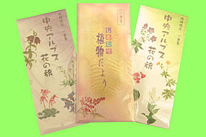 地域限定で販売していた中央アルプス花の旅1、2と、大人気のしあわせ植物一筆箋の3点セットです。ちょっとした贈り物に最適。